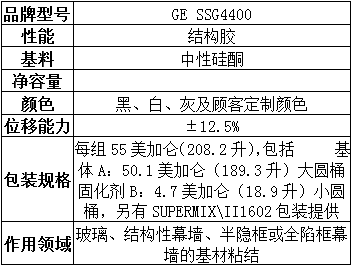 1.GE SSG 4400幕墻結構膠是具有高模量特性的雙組份中性硅酮膠。通過調節其混合比例而控制固化時間、形成耐用、高性能及具彈性的結構膠、能抗臭氧、紫外線及雨水等侵蝕。